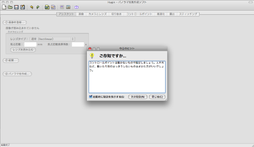 アプリケーションフォルダにコピーしたhuginを起動して以下のように表示されたら成功です。また、上部メニューより環境設定を開いて“一般”タブ内の“ハードウェアの利用”内にある画像のメモリキャッシュ等を環境に合わせて設定してください。